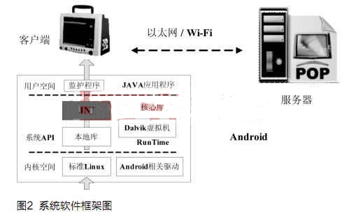 Android是Google與開發(fā)手機(jī)聯(lián)盟(Open Handset Alliance,OHA)推出的以Linux為內(nèi)核,真正意義上的開放性移動設(shè)備綜合平臺。從軟件結(jié)構(gòu)的角度上,Android系統(tǒng)分成4個層次: Linux操作系統(tǒng)及驅(qū)動、本地代碼框架、Java框架和Java應(yīng)用程序。圖2為本系統(tǒng)的軟件架構(gòu)圖。多參數(shù)采集前端通過異步串行口與OMAP3530通信,由于Java本身未提供串口的類庫,必須使用JNI(Java Native Interface)實現(xiàn)應(yīng)用層與串口硬件的數(shù)據(jù)傳送。數(shù)據(jù)采集、處理、顯示及網(wǎng)絡(luò)傳輸使用多線程和隊列緩沖機(jī)制來保證數(shù)據(jù)的實時性和完整性。網(wǎng)絡(luò)使用C/S架構(gòu),充分發(fā)揮服務(wù)器上的硬件優(yōu)勢,完成更多監(jiān)護(hù)信息的顯示和分析。