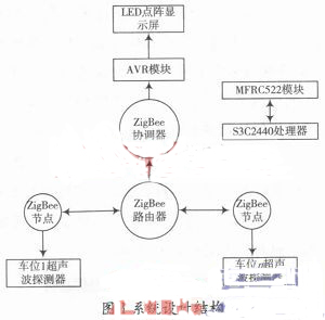本系統(tǒng)主要由三部分組成:第一部分是無線傳感網(wǎng)絡(luò),它由ZigBee協(xié)調(diào)器、路由器以及帶有超聲波傳感器的終端節(jié)點組成;第二部分是射頻計費,由S3C2440和MFRC522射頻模塊組成;第三部分是信息顯示系統(tǒng),由AVR單片機和點陣顯示屏組成。圖1所示是系統(tǒng)的設(shè)計結(jié)構(gòu)圖。