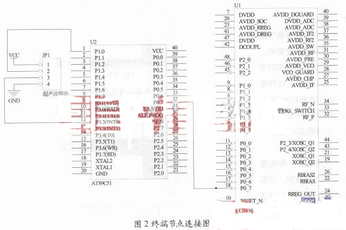 本設(shè)計中的終端節(jié)點由CC2430模塊、超聲波傳感器與51單片機組成。超聲波傳感器的發(fā)送和接收端與51單片機的P1.0和P3.2相連,51單片機信息輸出端再與CC2430模塊的中斷接口相連。圖2所示是終端節(jié)點的連線圖。