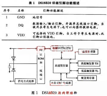 DS18B20的內(nèi)部結(jié)構(gòu)如圖1所示,他主要包括溫度傳感器、64位激光ROM單線單口、存放中間數(shù)據(jù)的高速暫存器、用于存儲(chǔ)用戶設(shè)定的溫度上下限值、觸發(fā)器存儲(chǔ)與控制邏輯、8位循環(huán)冗余校驗(yàn)碼發(fā)生器等。