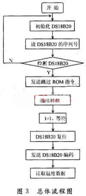 基于DS18B20數(shù)字溫度傳感器的軟件設(shè)計(jì)采用C51編寫程序,主要完成DS18B20的測(cè)量溫度值計(jì)算及溫度值的顯示功能。其采用模塊化設(shè)計(jì),程序設(shè)計(jì)包括系統(tǒng)初始化、復(fù)位程序、讀取溫度程序、溫度轉(zhuǎn)換程序、數(shù)碼管顯示程序和延時(shí)程序,其總體流程圖如圖3所示。