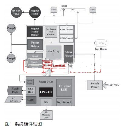 系統(tǒng)對人體呼吸氣體的檢測主要是通過高效的氣路及其控制得以實現(xiàn)的。對于進樣的氣體,系統(tǒng)有兩種不同的檢測手段:對于較高濃度的氣體,步進電機驅(qū)動六通閥,切換至“直接進樣”狀態(tài),即氣體由進樣口進入氣室,在氣室中與處于加熱狀態(tài)的金屬氧化物氣體傳感器陣列(Gas Sensor Array)接觸;而對于較低濃度的氣體,六通閥將切換至“吸附進樣”狀態(tài),即氣體從進樣口進入氣路之后,在吸附解吸附單元(EDU)中進行富集(常溫),并在富集程序完畢之后,載氣由載氣口進入,將標志物氣體從PID控溫狀態(tài)下的EDU中帶出,并進入氣室,這是本系統(tǒng)實現(xiàn)氣體檢測功能基本的檢測原理與流程。在這個過程中需要LPC2478對氣路狀態(tài)(六通閥切換、EDU控溫、真空泵抽氣速率與氣體傳感器陣列信號采樣等)進行全程監(jiān)控與測量,并通過TFT液晶、鍵盤陣列與用戶實現(xiàn)友好的交互。