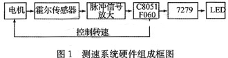本系統(tǒng)采用單片機(jī)C8051F060作為主控制器,使用霍爾傳感器測量電機(jī)的轉(zhuǎn)速,通過7079最終在LED上顯示測試結(jié)果,硬件組成如圖1所示。此外,還可以根據(jù)需要調(diào)整控制電機(jī)的轉(zhuǎn)速。