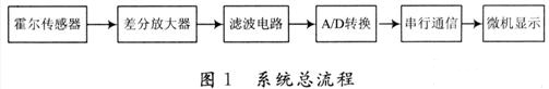 這里采用霍爾傳感器作為前端進(jìn)行數(shù)據(jù)采集,然后在單片機(jī)控制下進(jìn)行A/D轉(zhuǎn)換,并將信號(hào)通過串口送給PC機(jī)進(jìn)行繪圖處理。