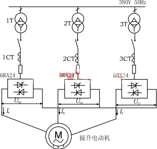 SIMOREGK6RA24是SIEMENS生產(chǎn)的一種緊湊式三相交流直接供電的全數(shù)字直流調(diào)速裝置,設(shè)計(jì)電流范圍15A~120A。其基于高性能的16位微處理器,采用參數(shù)組態(tài)方式用軟件實(shí)現(xiàn)調(diào)速傳動(dòng)控制系統(tǒng)的各種控制功能,具有較高技術(shù)水平。該全數(shù)字交交變頻系統(tǒng)采用三臺(tái)6RA24構(gòu)成,主電路為三相橋式,速度-電流雙閉環(huán)控制,邏輯無環(huán)流工作方式。外環(huán)為速度環(huán),實(shí)現(xiàn)精確的速度控制,內(nèi)環(huán)為3個(gè)電流環(huán),以滿足三相電流的平衡和協(xié)調(diào)配合,對(duì)三相電流進(jìn)行交流調(diào)制以使輸出電流波形為正弦波。主電路接線如圖1所示。