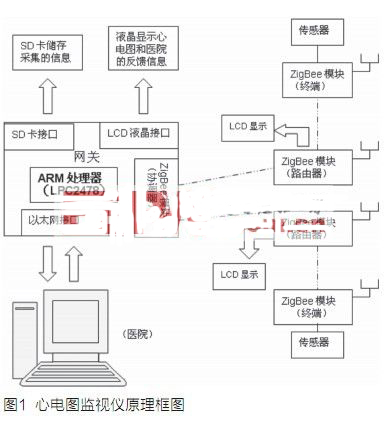 該系統(tǒng)中的傳感器用來檢測心電圖的微弱信號,再經(jīng)過放大濾波等調(diào)理之后進(jìn)行編碼,然后通過ZigBee無線模塊發(fā)送到基于ARM和ZigBee協(xié)調(diào)器模塊的網(wǎng)關(guān),通過外圍接口發(fā)送到上位機(jī)進(jìn)行顯示處理,然后通過以太網(wǎng)傳送給社區(qū)診所,診所再將每個人的信息通過ZigBee無線模塊返回給各自的家庭,并在LCD上顯示醫(yī)院反饋的處理信息。通過合理選擇芯片能夠?qū)崿F(xiàn)低功耗、低成本,檢測微弱的心電圖波形變化。