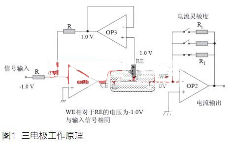 血糖測量通常采用電化學(xué)分析中的三電極體系。三電極體系是相對于傳統(tǒng)的兩電極體系而言,包括,工作電極(WE),參比電極(RE)和對電極(CE)。參比電極用來定點位零點,電流流經(jīng)工作電極和對電極工作電極和參比電極構(gòu)成一個不通或基本少通電的體系,利用參比電極電位的穩(wěn)定性來測量工作電極的電極電勢。工作電極和輔助電極構(gòu)成一個通電的體系,用來測量工作電極通過的電流。利用三電極測量體系(圖1),來同時研究工作電極的點位和電流的關(guān)系。