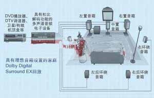 下面介紹一種典型的家庭影院環(huán)境,該環(huán)境擁有可在解壓縮及放大至適當(dāng)音量后再現(xiàn)多聲道音響效果的典型揚(yáng)聲器配置。在此特定情況下,解壓縮技術(shù)采用可提供8個(gè)聲道音頻內(nèi)容(7個(gè)聲道全帶寬音頻和承載超低頻的第八聲道)的Dolby Digital EX。為保持針對影院創(chuàng)造的攝影棚的設(shè)置,相對于視頻內(nèi)容將聲道提前或滯后,以確保聲音抵達(dá)聽眾位置后能與銀幕上的畫面同步。須注意的是,相對于公共影院而言,家庭影院環(huán)境中的揚(yáng)聲器數(shù)量要少得多。如果想要保持多維攝影棚的音效,則這種局限將使揚(yáng)聲器的布置變得極為關(guān)鍵。