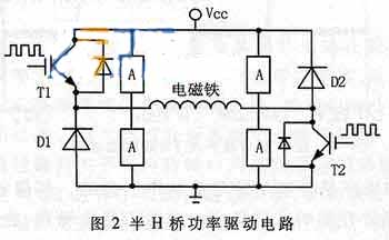 懸浮控制系統(tǒng)由DSP、FPGA、A/D轉(zhuǎn)換器、傳感器、功率斬波器和電磁鐵等單元組成??刂频哪康氖潜3蛛姶盆F與軌道之間的距離恒定,為磁浮列車提供穩(wěn)定的支撐。系統(tǒng)結(jié)構(gòu)見圖1。其中A/D轉(zhuǎn)換器采用MAXIM公司的MAX125,它是一種帶同步鎖存的14位4輸入A/D轉(zhuǎn)換芯片,4路同時工作時最高采親友速率為76ksps,用于采樣傳感器的輸出信號。DSP采用ADI公司的ADSP2181,用于控制算法的計算。FPGA采用ALTERA公司的EPF6016,用于產(chǎn)生PWM波和實現(xiàn)一些輔助功能。傳感器包括間隙傳感器和電流傳感器。功能驅(qū)動彩IGBT組成的半H橋網(wǎng)絡(luò),如圖2所示。功率管T1、T2由PWM波形驅(qū)動。PWM波為高電平時導(dǎo)通,低電平時關(guān)斷,功率管關(guān)斷時通過功率二極管D1、D2續(xù)流。圖中的A是吸引網(wǎng)絡(luò),防止反沖電壓過高損壞器件。該電路的特點是:當(dāng)一個周期內(nèi)T1、T2導(dǎo)通時間小于50%時,電磁鐵上電流為0。