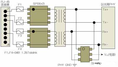 圖1:使用TVS二極管陣列為以太網(wǎng)介面提供二階段式防雷保護(hù)。