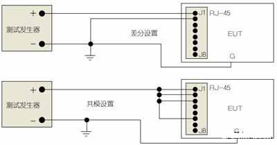 檢查設(shè)備的EFT抗擾性(按照IEC 61000-4-4標(biāo)準(zhǔn))與對(duì)共模雷擊浪涌所做的測(cè)試非常相似。在圖3所示的比較典型的配置中,所有導(dǎo)體(或引腳)均是電容性耦合至測(cè)試發(fā)生器的正極端,且對(duì)于GND顯示“激增”。如果數(shù)據(jù)線均衡良好,在組對(duì)之間將不會(huì)有差分能量,但是變壓器的耦合電容會(huì)再次將共模能量轉(zhuǎn)移到驅(qū)動(dòng)端,即使是以較低的水平。