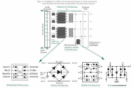 圖2:用于建筑物之間的以太網(wǎng)線路可采用超快TVS二極管、熔斷器,以及超低電容二極管陣列實(shí)現(xiàn)保護(hù)