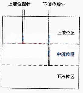 多數(shù)通用變頻器都能實現(xiàn)不同的條件運行不同的頻率。這在富士5000G11S/P11S系列變頻器中稱為多步頻率運行,在ABBACS510-01系列變頻器中稱為恒速運行。液位控制器就是要讓泵根據(jù)液位的情況來選擇不同的轉(zhuǎn)速,讓泵的運轉(zhuǎn)實現(xiàn)宏觀上的穩(wěn)定。如下圖所示,該控制器使用了兩個位置探針,可將泵池分為三個液位區(qū),當液體沒有接觸下液位探針時,變頻器工作在最低頻率區(qū);當液位處在兩探針中間時,變頻器工作在中頻率區(qū),當液位同時觸及兩個探針時,變頻器作在高頻率區(qū)。