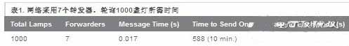 由于距離或變壓器產生的PLC信號衰減,集中器不能直接與每個節(jié)點進行通信。這種情況下,采用G3-PLC網(wǎng)狀架構,使每個節(jié)點成為轉發(fā)器,轉發(fā)集中器與每個節(jié)點之間的消息。本例采用了7個轉發(fā)器(表1),平均轉發(fā)延遲時間0.005s,采用單個集中器,集中器輪詢所有節(jié)點,集中器將一條消息發(fā)送至每盞燈的總時間為10分鐘。這一時間間隔允許經(jīng)營者根據(jù)每盞燈的位置(例如:山坡上、地下通道內或低谷)點亮路燈或更改光度。即使必須控制全部路燈,最大延遲也只有10分鐘。如果需要將相同命令發(fā)送給所有路燈,例如緊急“打開”命令,可使用廣播命令,到達所有路燈的時間短于2s。