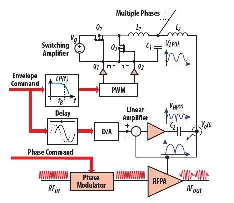 但如何能夠產(chǎn)生所要求的快速變化、帶寬處于數(shù)十兆赫茲(MHz)范圍的供電電壓?我們可以通過(guò)不同的方法來(lái)實(shí)現(xiàn)。其中一個(gè)方法是使用如圖2所示的混合式線性放大器和多相降壓轉(zhuǎn)換器,其中降壓轉(zhuǎn)換器只給負(fù)載組件/系列的傅里葉大功率、低頻部分供電。我們也有討論其他實(shí)現(xiàn)方法,如使用升壓轉(zhuǎn)換器或S類放大器。無(wú)論使用哪一個(gè)方法,氮化鎵技術(shù)可以推動(dòng)包絡(luò)跟蹤轉(zhuǎn)換器和寬帶RFPA設(shè)計(jì)。