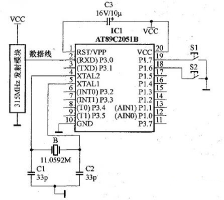 本文所介紹的無線收發(fā)電路采用ATMEL公司的AT89C2051單片機(jī)作為編碼和解碼電路的核心器件,接收端采用1602字符液晶顯示器顯示所接收到的數(shù)據(jù)。