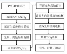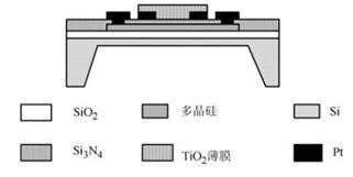 圖1是MEMS 結(jié)構(gòu)氧傳感器的示意圖。在P型硅襯底上熱氧化生長(zhǎng)SiO2 隔離層,采用LPCVD設(shè)備生長(zhǎng)多晶硅并光刻加熱電阻。為了控制加熱電阻的阻值,在多晶硅中摻入P。然后使用LPCVD法,在襯底正反兩面淀積Si3 N4 層,背面刻蝕腐蝕窗口,利用各向異性腐蝕技術(shù)刻蝕出硅杯。正面蒸Pt光刻得到叉指檢測(cè)電極。然后利用鈦靶采用交流磁控濺射鍍膜法,在檢測(cè)電極上生長(zhǎng)TiO2 敏感薄膜??煽吹?,該MEMS 結(jié)構(gòu)氧傳感器利用敏感膜下的磷多晶硅電阻作加熱器,采用了MEMS 的深刻蝕工藝, 從而減少器件的熱容量,降低功耗。把檢測(cè)電極和加熱電極合理設(shè)計(jì)成一體化器件,可以集成化生產(chǎn)、批量制作。整個(gè)芯片的尺寸為3 mm×3mm×0 .54 mm ,膜片厚度約為2 .5 μm,硅杯的杯底膜片尺寸為1 .4 mm× 1 .4 mm, 敏感膜片大小為0 .72mm×0 .72 mm。MEMS 結(jié)構(gòu)的TiO2 氧傳感器的工藝流程圖如圖2 所示。