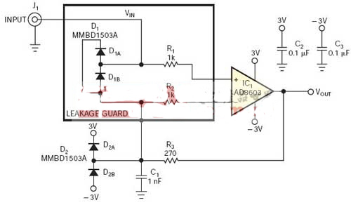 在某些測量應(yīng)用中,如pH值(酸度)和生物電勢需要高阻抗緩沖放大器。雖然有幾個(gè)半導(dǎo)體制造商提供具有低偏置和輸入偏置電流特點(diǎn)的放大器芯片,配上傳感器電纜可能會(huì)因?yàn)镋SD(靜電放電)對(duì)放大電路造成損害。圖1顯示一種不令人滿意的方法實(shí)現(xiàn)ESD保護(hù)。電阻R1抑制ESD的放電電流,而二極管D1A 和D1B鉗住放大器IC1的輸入到供電電源軌。不幸的是,當(dāng)并聯(lián)pH值傳感器的為400MΩ輸入阻抗時(shí),即使采用低漏電流二極管,如Fairchild公司的MMBD-1503A,仍引入很大的偏置電壓。