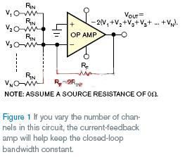 其中,N為輸入通道數(shù)。帶電壓反饋放大器的電路帶寬等于增益帶寬積除以噪聲增益。例如,如果使用180MHz增益帶寬積的電壓反饋放大器,三個輸入通道(N=3),增益–2V/V,電路閉環(huán)帶寬為25.7 MHz。額外的通道減少閉環(huán)帶寬,即使輸入信號持續(xù)達到–2V/V的增益。