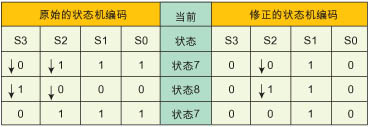如果狀態(tài)機(jī)采用格雷碼而不是二進(jìn)制碼來設(shè)計,則這兩個狀態(tài)之間的轉(zhuǎn)換所需的邏輯轉(zhuǎn)換量將降至僅為一位。另外,如果將狀態(tài)7和8分別編碼為0010和0011,亦可達(dá)到同樣的效果。