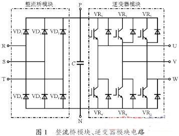 檢 查前,拆下逆變模塊、整流模塊與外部連接的電源線(R、S、T)和與電動(dòng)機(jī)連接的接線(U、V、W)端子,將萬(wàn)用表?yè)艿絉伊100贅擋。分別測(cè)量R、S、 T、U、V、W、P 和N 處,變換萬(wàn)用表表筆,測(cè)量其導(dǎo)通狀態(tài),便可判斷它們是否性能良好。整流橋模塊、逆變器模塊電路如圖1所示,測(cè)試結(jié)果見(jiàn)表1。