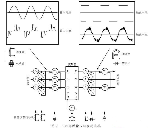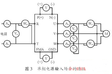 變頻器的電源側(cè)、輸出側(cè)的電壓、電流因?yàn)楹懈哳l成分,所以測(cè)量?jī)x表和測(cè)量回路不同,所得到的數(shù)據(jù)也是不同的。用工頻儀表測(cè)量時(shí),三相電源輸入場(chǎng)合的連接如圖2 所示,單相電源輸入場(chǎng)合的連接如圖3 所示。