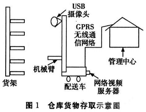 本系統(tǒng)基于USB攝像頭的圖像采集子系統(tǒng),ARM處理器子系統(tǒng)和無線網(wǎng)絡(luò)數(shù)據(jù)傳輸子系統(tǒng)組成了視頻服務(wù)器系統(tǒng)。通過三星S3C2410開發(fā)板上的GPRS模塊實(shí)現(xiàn)了與管理中心的數(shù)據(jù)交互傳輸。通過USB攝像頭接收?qǐng)D像數(shù)據(jù),實(shí)施對(duì)貨架位置的定位識(shí)別,然后將識(shí)別信息通過GPRS模塊設(shè)備發(fā)送到配送管理中心。管理中心向配送車發(fā)送控制命令,將配送車上的貨物放置到指定的貨架位置,或從指定的貨架位置上取出貨物,裝載到該配送車。如圖1所示。