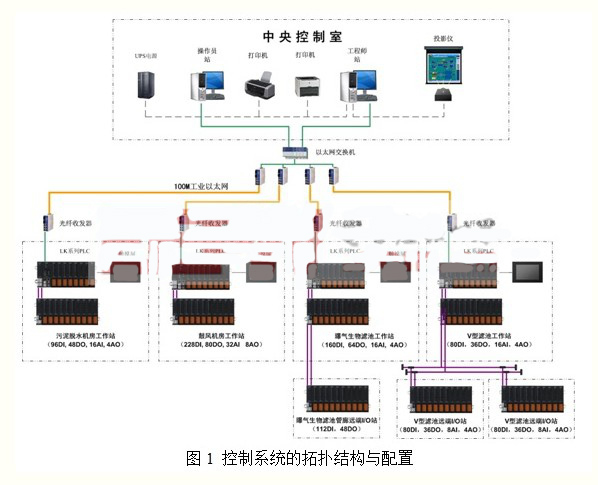 海興縣污水廠控制系統(tǒng)的拓撲結構與功能配置如圖1 所示: