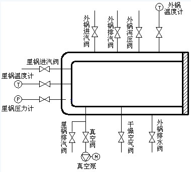 滅菌器主要進(jìn)行包裹類(lèi)、器械類(lèi)、乳膠類(lèi)、液體類(lèi)及其它類(lèi)五項(xiàng)進(jìn)行滅菌,其工藝大體相同,不同之處可由程序控制。通過(guò)其工作原理(圖1)可知,根據(jù)里外鍋的溫度和壓力是否達(dá)到規(guī)定值而進(jìn)行各種動(dòng)作控制。