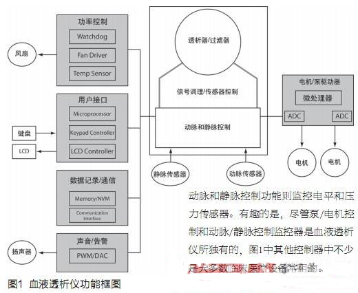 為了實(shí)現(xiàn)其主要功能,血液透析儀采用數(shù)個(gè)微控制器,用于監(jiān)視和控制血液與其它體液的流動(dòng)、發(fā)出警報(bào),以及在必要時(shí)關(guān)閉儀器(見圖1)。圖1所示為典型血液透析儀的某些功能。功率控制模塊執(zhí)行溫度感測(cè)以實(shí)現(xiàn)風(fēng)扇驅(qū)動(dòng),也執(zhí)行看門狗和電池備份功能。用戶模塊通過(guò)鍵盤或觸摸屏輸入病患信息,進(jìn)行治療參數(shù)的定制。它還能夠協(xié)助醫(yī)療服務(wù)提供者更好地監(jiān)控透析期間病患的身體狀態(tài)和治療效果。