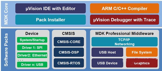 MDK Core包含微控制器開發(fā)所有的所有組件,包括IDE(uVision5)、編輯器、ARM C/C++編輯器、uVision調試跟蹤器和Pack Installer。