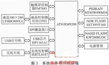 為了實(shí)現(xiàn)打印模塊與USB打印機(jī)的通信,選用Philips公司的ISP1161A1芯片作為USB主機(jī)控制器。ISP1161A1的主機(jī)控制器部分符合USB1.1規(guī)范,支持全速(12Mbi/s)和低速(1.5 Mbi/s)的數(shù)據(jù)傳輸。ISP1161A1提供兩個下行端口,可與USB打印機(jī)進(jìn)行連接。WiFi無線模塊采用的是G—SKY無線發(fā)射模塊,其發(fā)射芯片是Realtek公司的RTL8187芯片。液晶采用320×240的LFUBK909XA彩色(256色)點(diǎn)陣圖形液晶模塊,液晶控制器芯片為S1D13503。該液晶屏上帶有觸摸屏,采用觸摸屏控制器FM7843進(jìn)行A/D轉(zhuǎn)換,轉(zhuǎn)換結(jié)果輸出到AT91RM9200處理器。系統(tǒng)總體硬件框圖如圖3所示。
