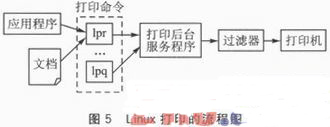 CUPS作為通用打印系統(tǒng),默認(rèn)已支持多種類型的文檔的打印,Linux下的打印流程如圖5所示。