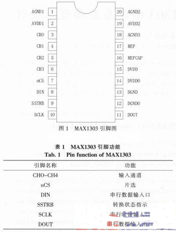 MAX1303是MAXIM公司推出的工業(yè)級、低功耗、多量程、16位精度的模/數(shù)轉換芯片,采用+5 V單電源供電,最高采樣率可達115kbps??墒褂?4.096 V片上基準或者3.800到4.136 V之間的外部電壓基準。采用20引腳的TSOP封裝。它的引腳如圖1所示。