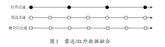 本文綜合應(yīng)用點跡合并方法和點跡串行處理方法,搭建毫米波雷達(dá)和紅外數(shù)據(jù)融合的多傳感器平臺。假設(shè)雷達(dá)的掃描周期為5 ms,紅外的掃描周期為10 ms,所以首先將雷達(dá)和紅外點跡數(shù)據(jù)串行合并成為點跡數(shù)據(jù)流,進(jìn)行點跡-航跡相關(guān);對于在10 ms時刻,若雷達(dá)點跡和多個紅外點跡均與航跡相關(guān)上,則對這些點跡進(jìn)行點跡壓縮合并,如圖1所示。
