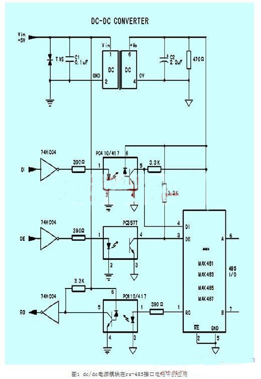 dc/dc電源模塊在rs-485接口電路的應用(dc/dc電源模塊:隔離電壓1000vdc,in:5v,out:5v,p:1w),其電路如圖1所示。