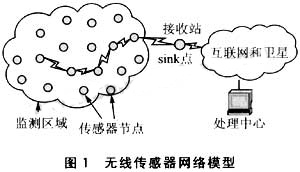 無線傳感器網(wǎng)絡(luò)模型(如圖1所示)是不同于傳統(tǒng)無線網(wǎng)絡(luò)的以基礎(chǔ)設(shè)施網(wǎng),通過在監(jiān)測區(qū)去內(nèi)隨意布撒大量傳感器節(jié)點(diǎn)(簡稱節(jié)點(diǎn)),由各節(jié)點(diǎn)自行協(xié)調(diào)并迅速組建通信網(wǎng)絡(luò),在能量利用率優(yōu)先考慮原則下進(jìn)行工作任務(wù)劃分以獲取監(jiān)視區(qū)域的信息,網(wǎng)絡(luò)的自組織特性體現(xiàn)在當(dāng)節(jié)點(diǎn)失效或新節(jié)點(diǎn)加入時(shí)網(wǎng)絡(luò)能夠自適應(yīng)重新組建,以調(diào)整全局的探測精度,充分發(fā)揮資源優(yōu)勢,即網(wǎng)絡(luò)中的各節(jié)點(diǎn)除具備數(shù)據(jù)采集功能外兼有數(shù)據(jù)轉(zhuǎn)發(fā)實(shí)現(xiàn)多跳的路由功能。