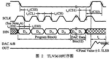 TLV5618是TI公司帶緩沖基準(zhǔn)輸入(高阻抗)的雙路12 位電壓輸出DAC,通過CMOS 兼容的3線串行總線實現(xiàn)數(shù)字控制。器件接收16 位命令字,產(chǎn)生兩路D/A模擬輸出。TLV5618只有單一I/O周期,由外部時鐘SCL K決定,延續(xù)16 個時鐘周期,將命令字寫入片內(nèi)寄存器,完成后即進(jìn)行D/A轉(zhuǎn)換。TLV5618讀入命令字是從CS的下降沿開始有效,從下一SCLK的下降沿開始讀入數(shù)據(jù),讀入16位數(shù)據(jù)后即進(jìn)入轉(zhuǎn)換周期,直到下次出現(xiàn)CS的下降沿。 其操作時序圖如圖2 所示。