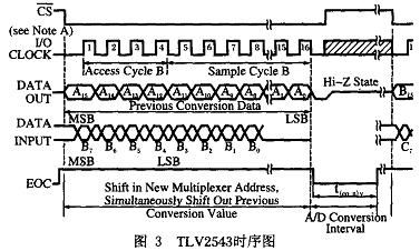 TLC2543是TI公司的帶串行控制和11個輸入端的12 位、開關(guān)電容逐次逼近型A/D轉(zhuǎn)換器。 片內(nèi)轉(zhuǎn)換器有高速、高精度和低噪音的特點。 TLC2543工作過程分為兩個周期:I/O周期和轉(zhuǎn)換周期。I/O周期由外部時鐘SCLK決定,延續(xù)8、12或16個時鐘周期,同時進(jìn)行兩種操作: 在SCLK上升沿以MSB方式輸入8位數(shù)據(jù)到片內(nèi)寄存器;在SCLK下降沿以MSB 方式輸出8、12、16位轉(zhuǎn)換結(jié)果。轉(zhuǎn)換周期在I/O周期的最后一個SCLK下降沿開始,直到EOC信號變高,指示轉(zhuǎn)換完成。 為了與TLV5618的I/O周期一致,采用了MSB方式,使用CS的16 時鐘傳送的時序。其操作時序如圖3 所示。