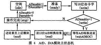 系統(tǒng)設(shè)計中,將AD、DA操作封裝成一單獨模塊,由上層控制模塊輸出命令字及控制信號啟動本模塊的相應(yīng)操作,操作完成后(進(jìn)入idle狀態(tài)) ,本模塊發(fā)出相應(yīng)狀態(tài)信號至上層模塊。