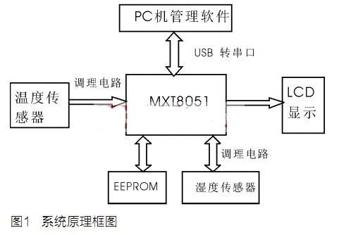 系統(tǒng)基于MXT8051混合信號微處理器來開發(fā),兼具低成本和高性能,主要包括六個部分:MXT8051處理器、溫度傳感器及調理電路、濕度傳感器及調理電路、LCD顯示和PC機管理軟件,系統(tǒng)原理框圖如圖1所示。