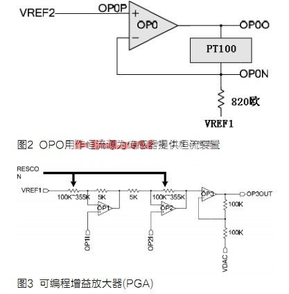溫度測量采用恒流源測溫方式,測量調理電路如圖2、圖3所示,采用MXT8051的片上資源。如圖2所示,利用OP0、VREF1、VREF2和外部電阻820Ω構成恒流源為傳感器PT100供電。 如圖3所示,OP1、OP2與可控電阻網(wǎng)絡一起組成一個差分輸入的PGA。OP3起調零的作用。兩個可調電阻由RESCON控制,且具有相同的阻值,調節(jié)范圍為100~355kΩ。