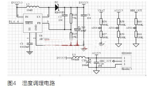 本文采用的濕度傳感器是Honeywell公司生產的HIH-4000。這是具有激光調整互換型容性變化的單片集成電路,其輸出電壓與RH值呈線性關系,精度高,響應時間快,漂移小, 典型工作電流僅為200mA,令HIH-4000 系列非常適合低功耗,電池工作的系統(tǒng)。在標準工作電壓(DC5V)和標準室溫(25℃)下,隨著RH值從0%到100%,對應的輸出電壓從0.96V到3.90V。本記錄儀使用單節(jié)鋰電池供電,而HIH-4000最佳工作電壓是5V,因此采用AIC1896進行升壓。使用AD通道1測量HIH-4000的工作電壓,AD通道2測量濕度輸出電壓,因為AD的參考電壓是1.26V,所以需要用300kΩ和100kΩ電阻進行分壓。濕度調理電路如圖4所示。