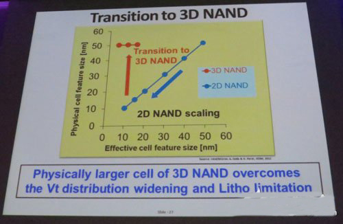 Esfarjani表示,2D NAND Flash目前仍然存在比例限制,在他播放的幻燈片中,其中有一頁指出2D NAND閃存可以擴(kuò)展到兩個(gè)節(jié)點(diǎn)在15nm和10nm,而且3D堆棧工藝很可能產(chǎn)生于15nm節(jié)點(diǎn),此外,Esfarjani還指出,目前16層的3D NAND在成本上還不能顯示出成本優(yōu)勢,需要64層堆棧,至少也要達(dá)到32層的水平才行。