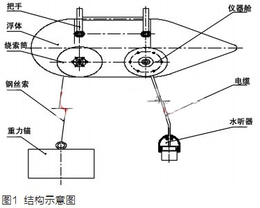本裝置采用雙體流線型玻璃鋼結構,中間裝配繞索筒和電路儀器艙,具有外形小,重量輕,浮力大,布放方便的特點。結構示意圖如圖1所示。