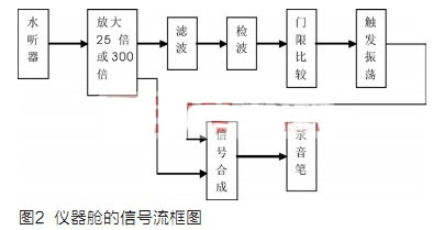 電路儀器艙用來實現對換能器信號的處理,最終將收取到的爆炸信號記錄到錄音筆中。電路儀器艙由放大電路、頻率變換合成電路、錄音筆,供電裝置組成。儀器艙的信號流框圖見圖2。