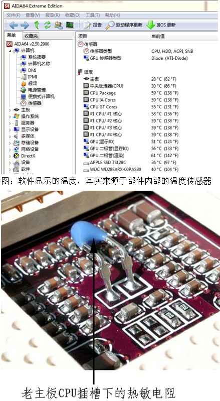 要想在最新的筆記本中看一看溫度傳感器長(zhǎng)什么樣,那可不是件容易的事情,畢竟,外置的電阻無(wú)法直接探測(cè)部件內(nèi)部溫度,再加上容易出現(xiàn)接觸不良的問(wèn)題。因此,只有在老主板的CPU插槽下“一睹芳容”。如今筆記本的溫度傳感器早已置身于各部件芯片中,如處理器、顯卡芯片、硬盤內(nèi)部,通過(guò)軟件顯示實(shí)際溫度。