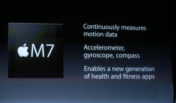 M7 協(xié)處理器,蘋果稱之為減輕 iPhone 5S 工作量并提高能效的芯片。該芯片可以從加速感應器、陀螺儀和指南針收集運動數(shù)據(jù),達到減輕 A7 芯片成噸負擔的效果,延長 iPhone 5S 的續(xù)航時間。換句話說,一大堆類似健身或者運動跟蹤數(shù)據(jù)的應用程序可以直接調(diào)用 M7 系處理器,而無需 A7 芯片參與工作,大大降低整機的耗電量。