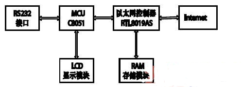 系統(tǒng)選用最常用的MCS 8051 系列單片機(jī),此類型單片機(jī)價(jià)格低廉且應(yīng)用廣泛。網(wǎng)卡選用臺(tái)灣Realtek公司生產(chǎn)的ATL8019AS 以太網(wǎng)控制器芯片。由于Internet 網(wǎng)絡(luò)協(xié)議的程序代碼量較大,所以系統(tǒng)除了單片機(jī)和網(wǎng)卡外,還增加了一些外圍電路。包括用作數(shù)據(jù)緩存的RAM 存儲(chǔ)器和RS232 接口,前者用作數(shù)據(jù)緩存器,后者作為單片機(jī)與現(xiàn)場(chǎng)設(shè)備進(jìn)行數(shù)據(jù)交互的接口。系統(tǒng)總體功能設(shè)計(jì)如圖1 所示。
