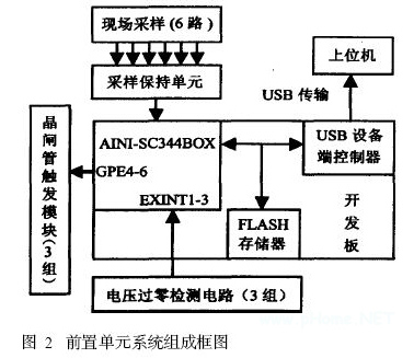 前置單元硬件電路的核心部分采用51EDA和勤研公司聯(lián)合研制的44B0X開發(fā)板。 該開發(fā)板使用SAMSUMG S3C44B0X處理器,并集成了其它外部設(shè)備,主要包括2 MB16 位數(shù)據(jù)寬度的線性Flash( SST39VF160) , 10M TCP / IP 接口(RTL8019 ) , USBDevice接口( Philip s PD IUSBD12) ,LCD接口, 7路ADC輸入,兩路標(biāo)準(zhǔn)RS232接口等等。此外,根據(jù)課題需要在設(shè)計中還自行擴(kuò)展了過零檢測電路,采樣保持電路和可控硅觸發(fā)電路。